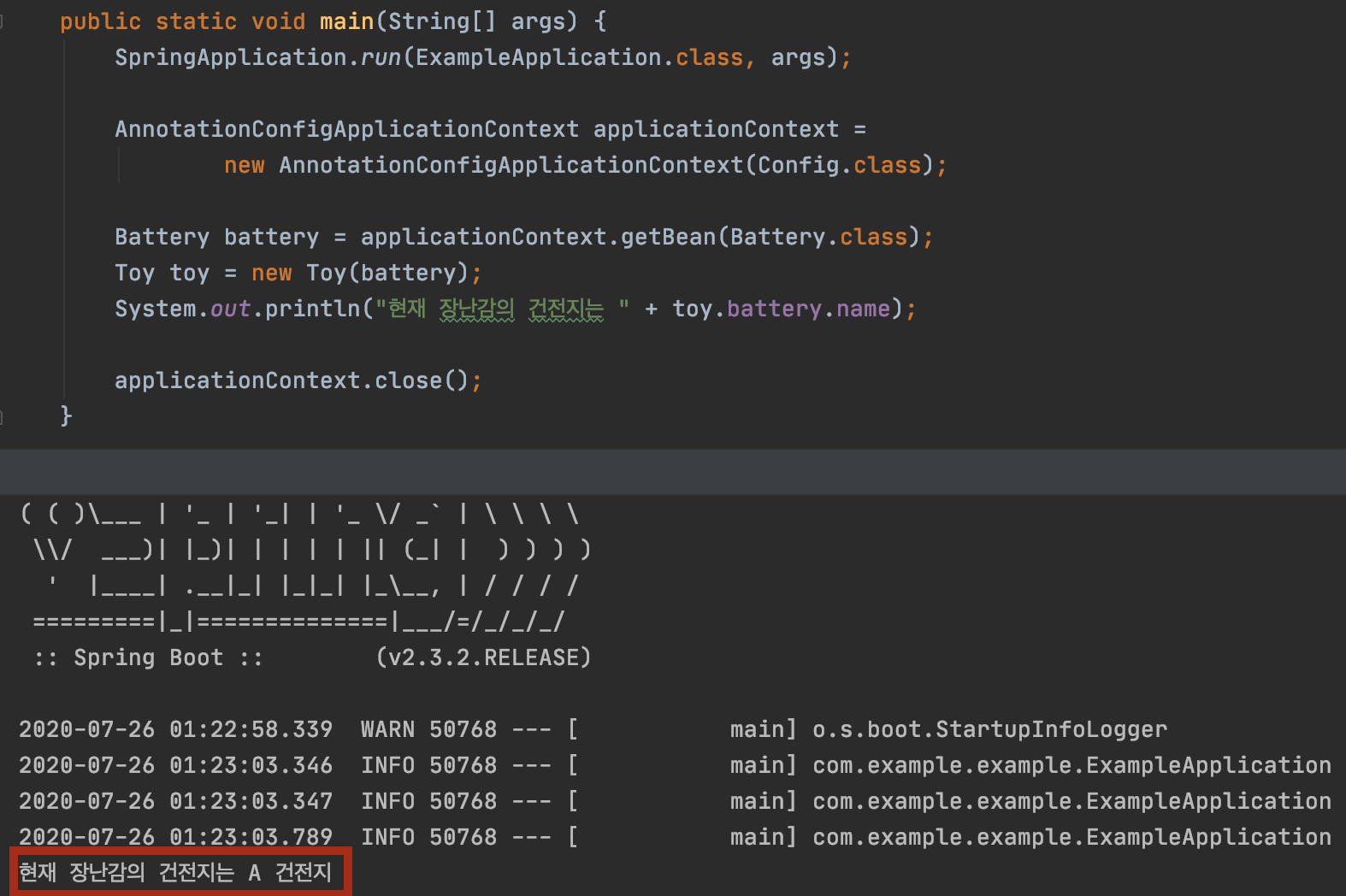Battery는 스프링 빈에 등록했던 (Config class에서) A 건전지가 나오게 됩니다.