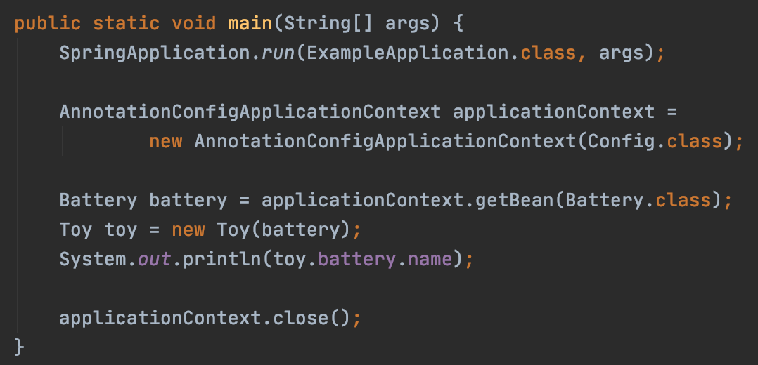 이 상태에서 Config class를 통해 빈으로 등록되어 있던 건전지를 B 건전지로 교체해 보겠습니다.