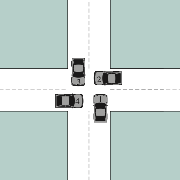 여기서 차는 직진만 가능 하다고 가정하겠습니다. 차들이 교차로를 모두 지나가기 위해서는 한 차가 지나갈 때는 마주 보고 있는 차가 아니라면 옆에서 오는 차들은 멈춰 있어야 합니다. 하지만 모든 차들이 먼저 통과하기 위해 순서 없이 직진을 한다면 아래와 같은 상황이 발생할 수도 있을 것입니다.