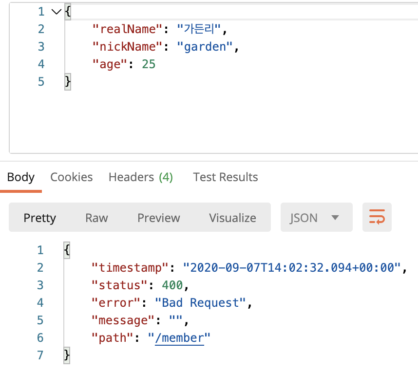클라이언트에서 요청을 잘못했다는 400 status code와 함께 에러 리스폰스를 응답해 준 것을 볼 수 있습니다.