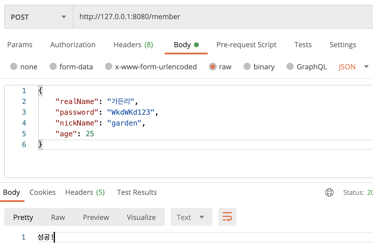 간단하게 "/member"에 MemberDto를 RequestBody로 받아보았습니다.
