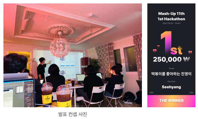 해커톤 행사에서는 1위를 해 상금을 타기도 했다.(상금을 지원해준 SSG에게 감사 드리며 해커톤을 캐리 해준 클라이언트 개발자, 디자이너 분들에게 감사 드린다. 서버가 미흡해서 죄송할 따름...)