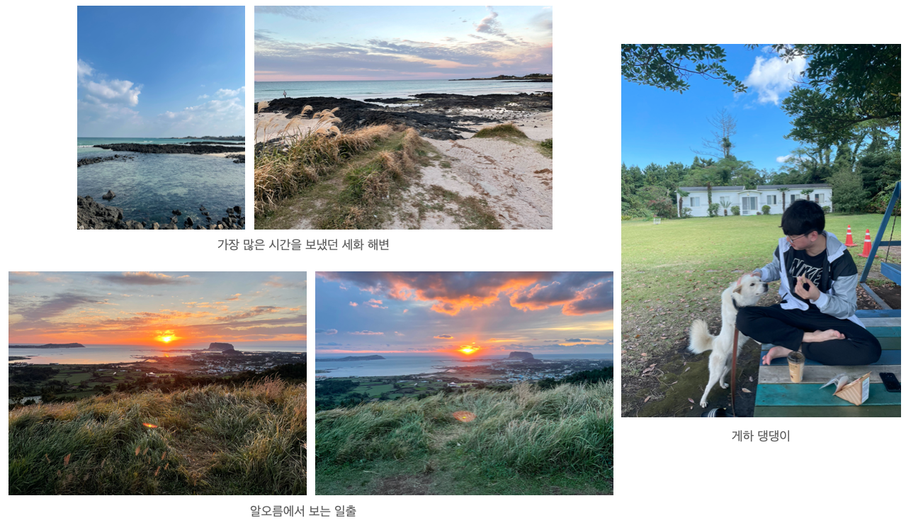 제주에서 근무를 하며 점심시간이나 근무 전 후로 바다 산책을 자주 했다. 해먹에 누워서 별을 보며 멍때리기도 하고 새벽에 일어나 일출을 보러 오름에 올라가기도 했다. 바다가 보이는 카페에서 아메리카노를 한 잔 하며 코딩을 하면 코드가 그렇게 잘 써...지진 않고 바다만 보인다. 근무를 할 때는 적당한 분위기는 필요 한 것 같다.(물론 제주에 근무 하면서 진행중이었던 프로젝트의 피쳐는 성실하게 잘 만들어 냈다.)